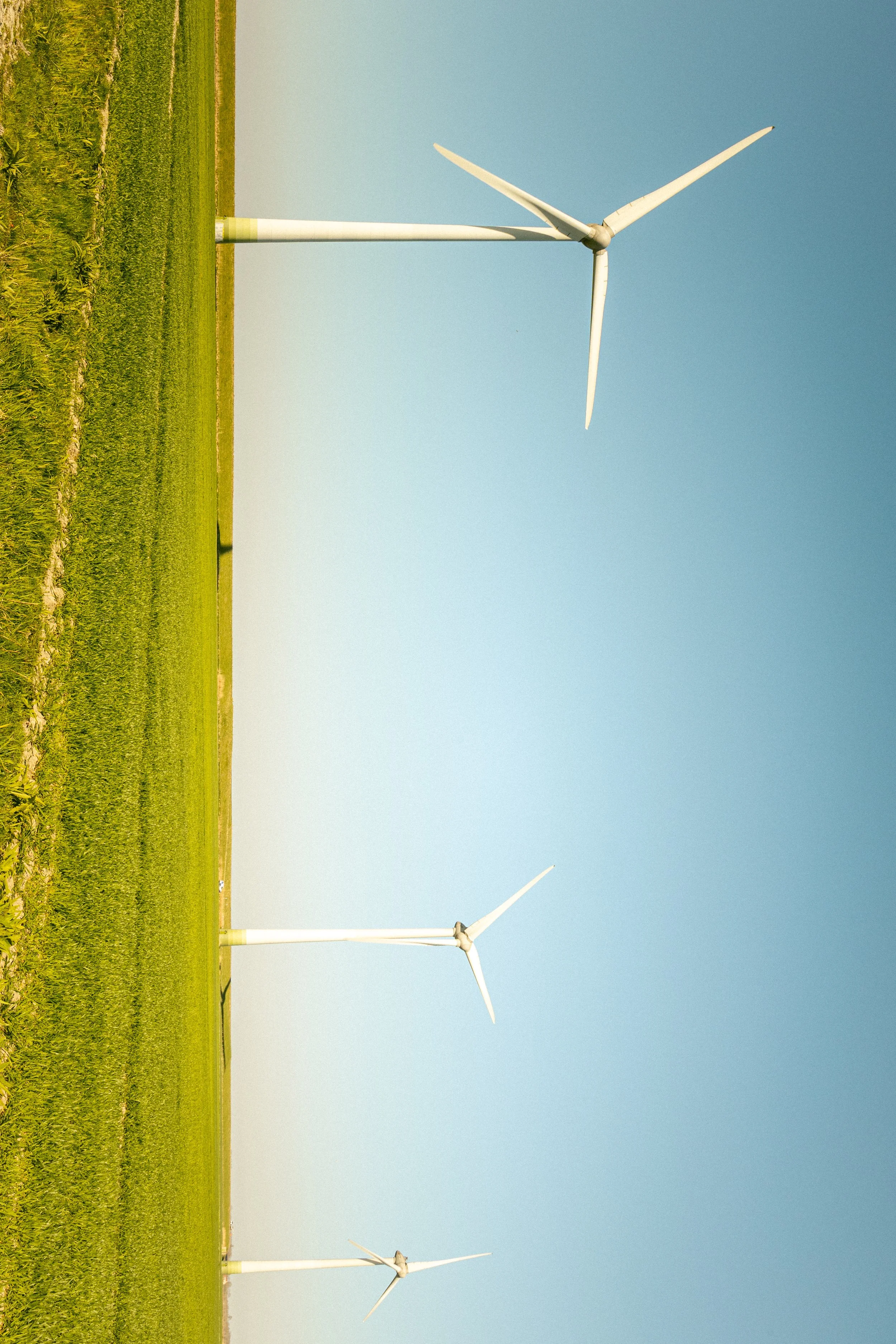 Close-up of pink tulip buds in a field with a wind turbine in the background under a clear sky.