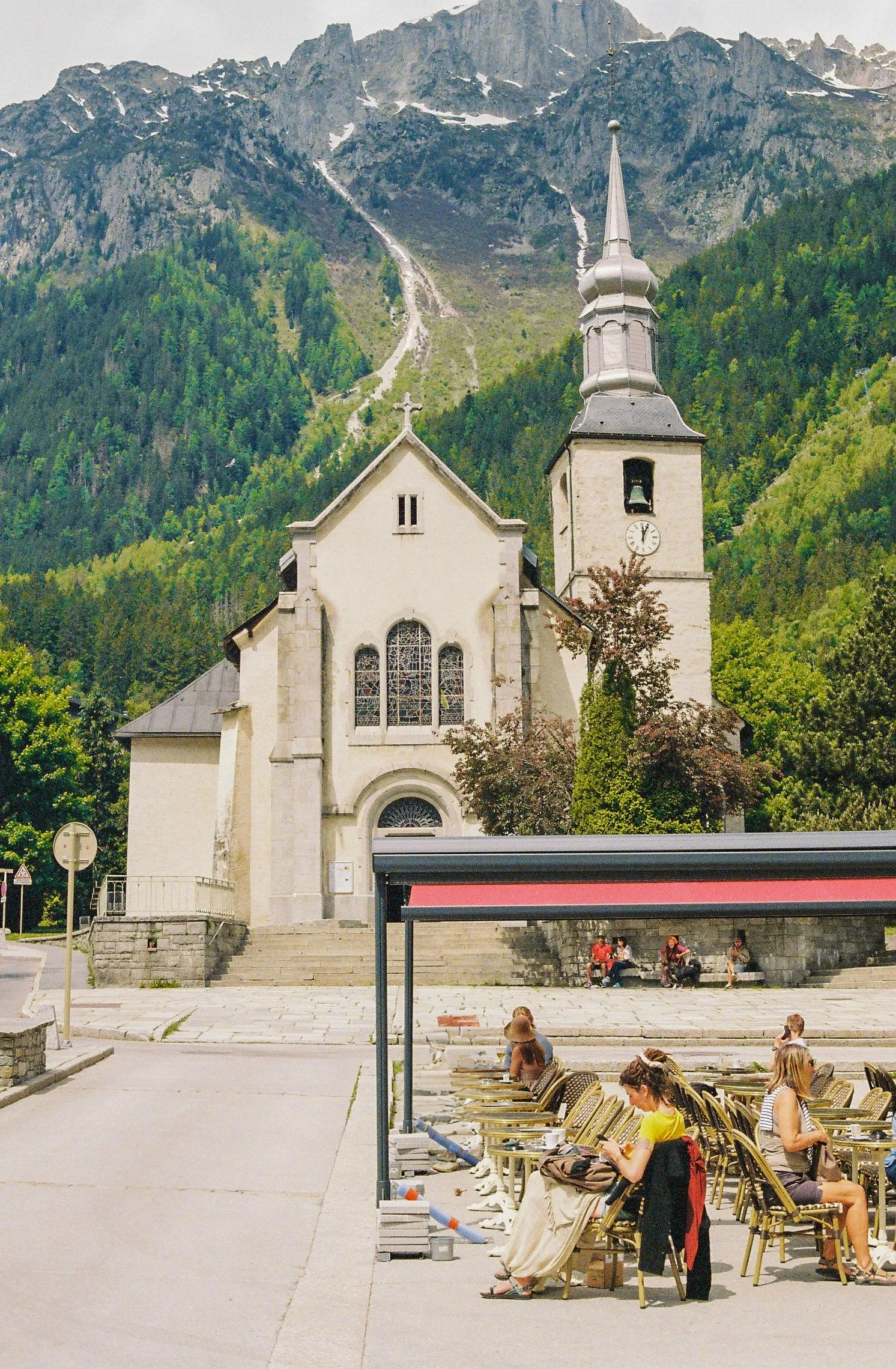 A rural scene with a large stack of firewood in the foreground, several houses with sloped roofs in the middle ground, and snow-capped mountains in the background, surrounded by green trees and grass.