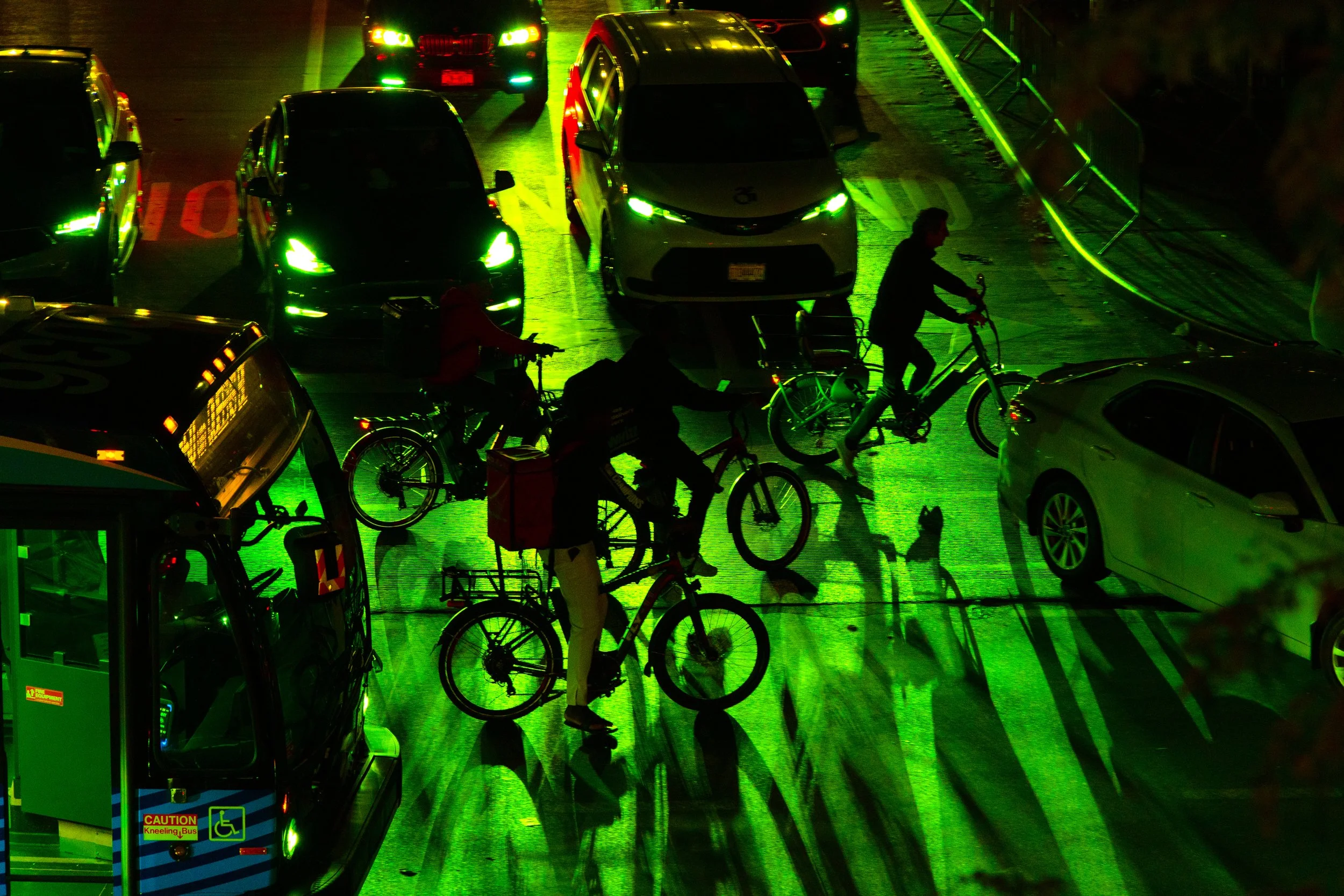 Nighttime scene of cyclists and parked cars, illuminated by green streetlights, with shadows cast on the pavement.