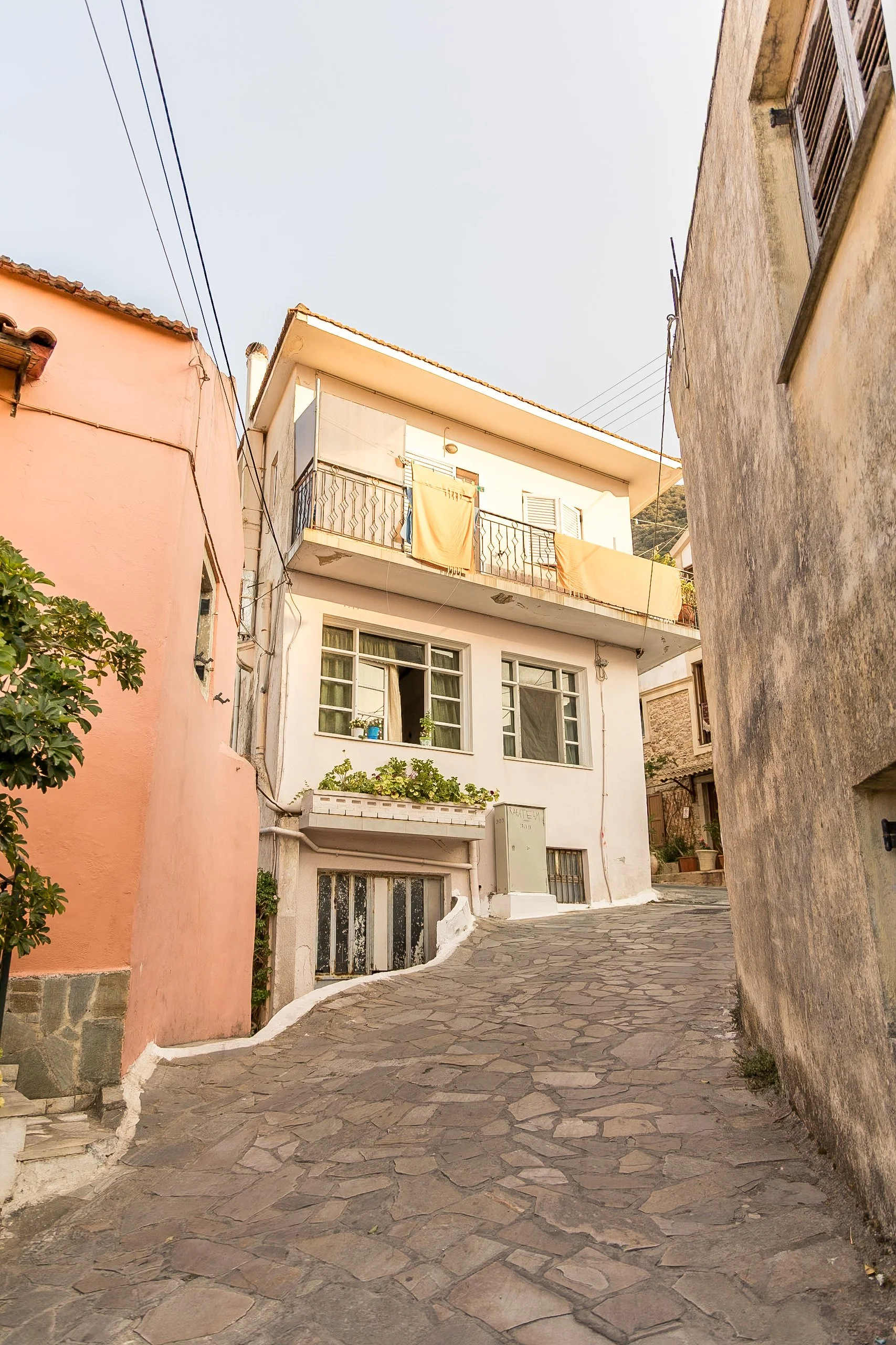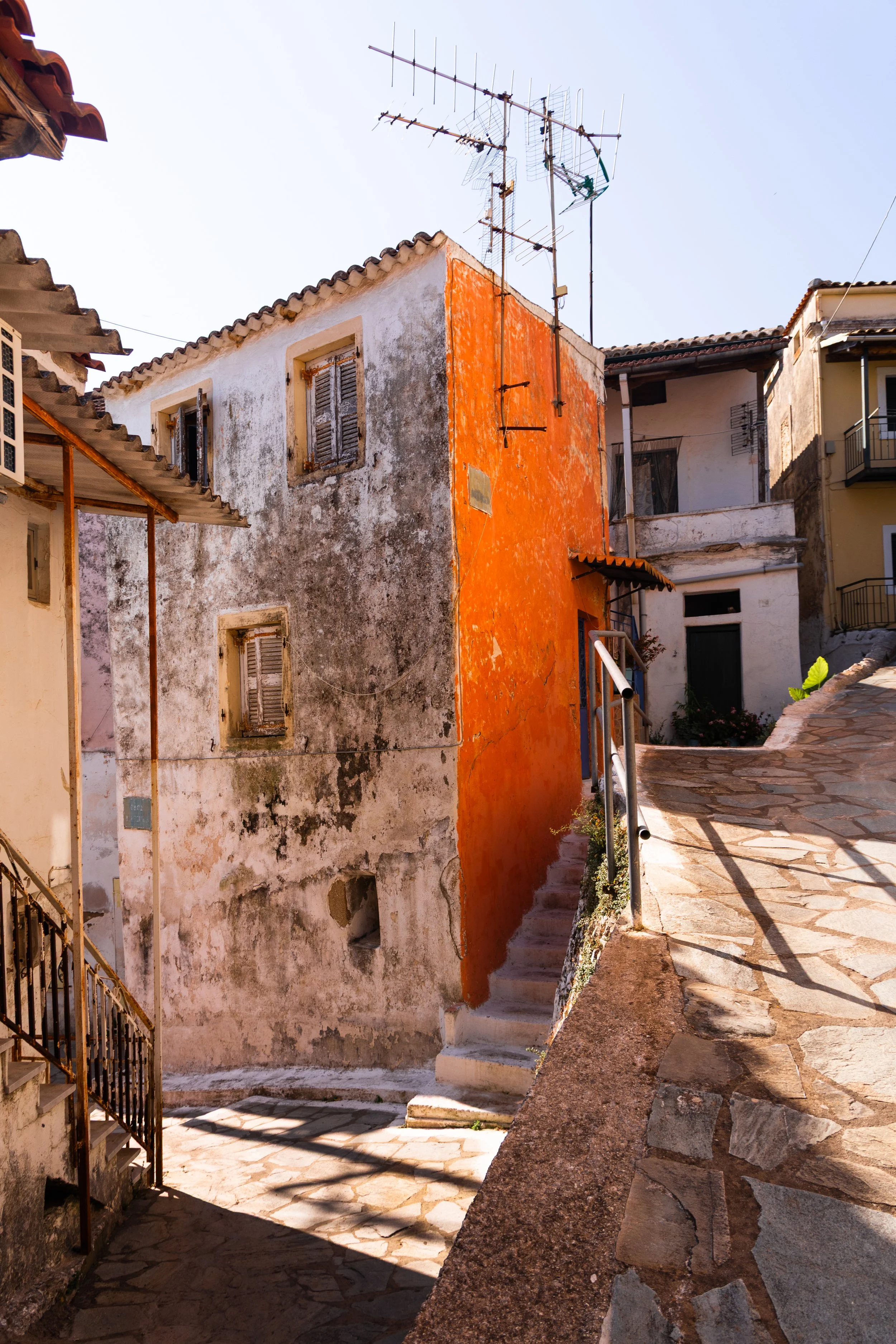 Old weathered buildings with a stone pathway and stairs leading up to a small alleyway, featuring a bright orange wall and television antennas on the roof.