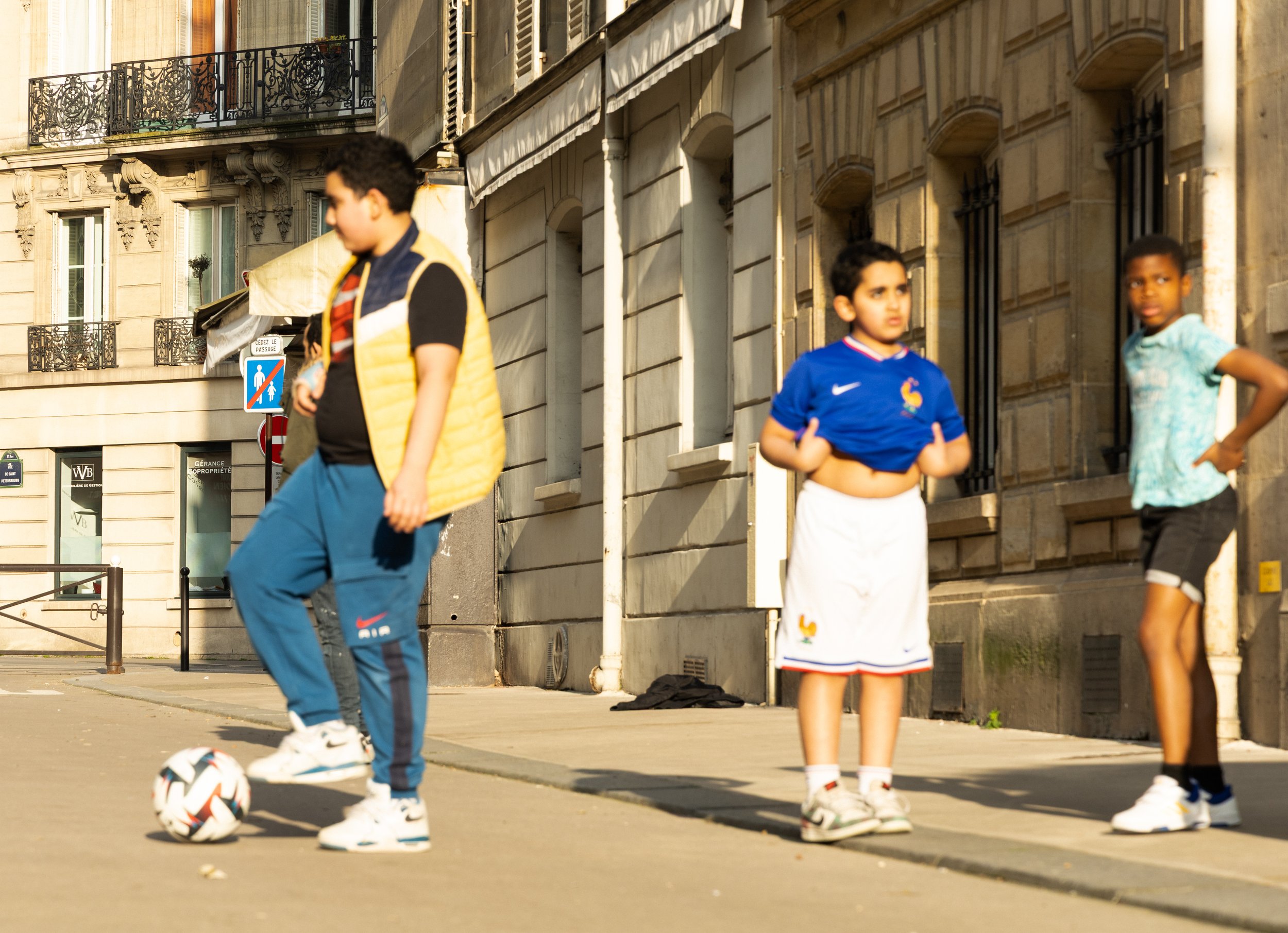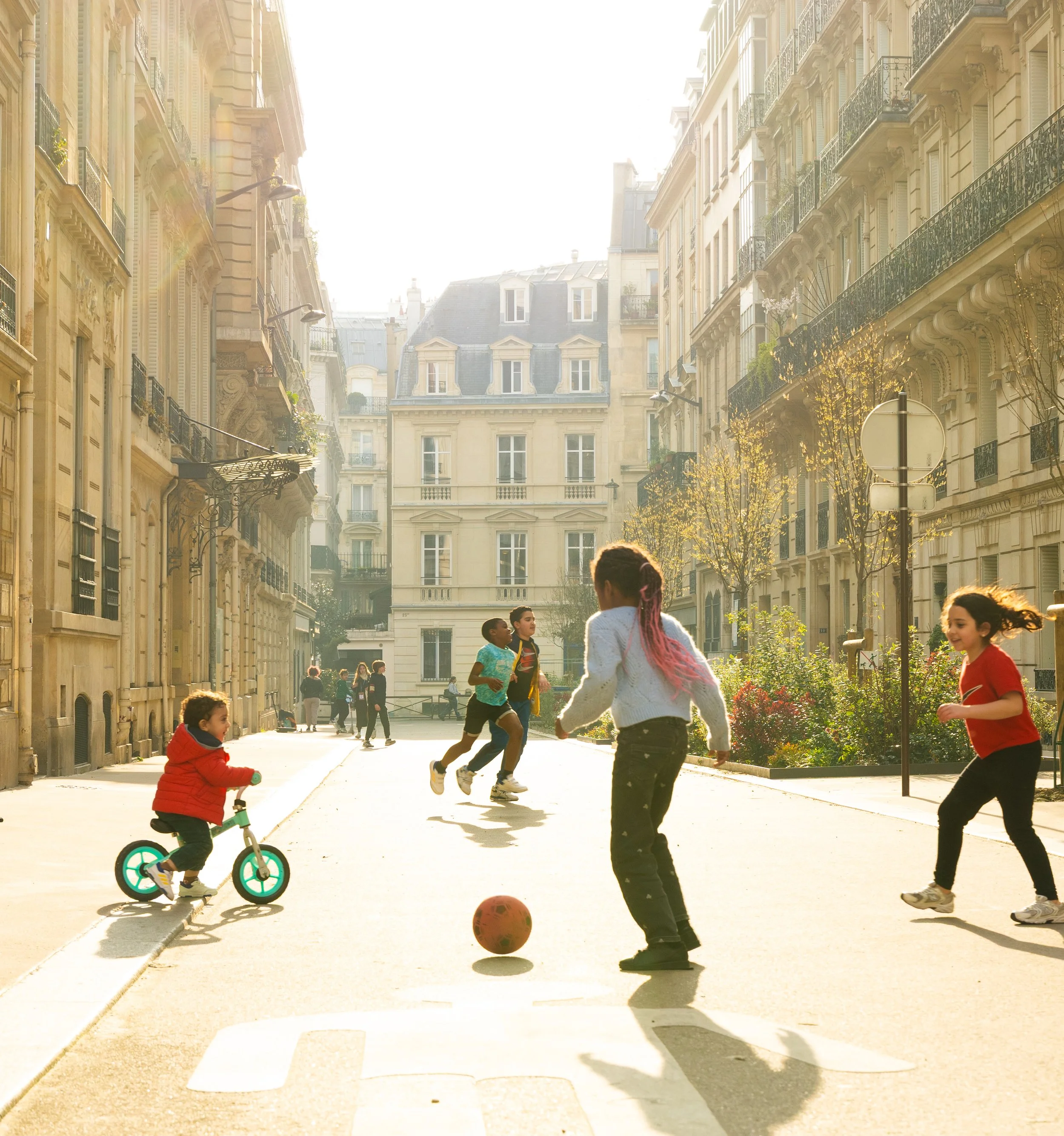 Children playing soccer and riding bikes on a sunny city street with classic European-style buildings.