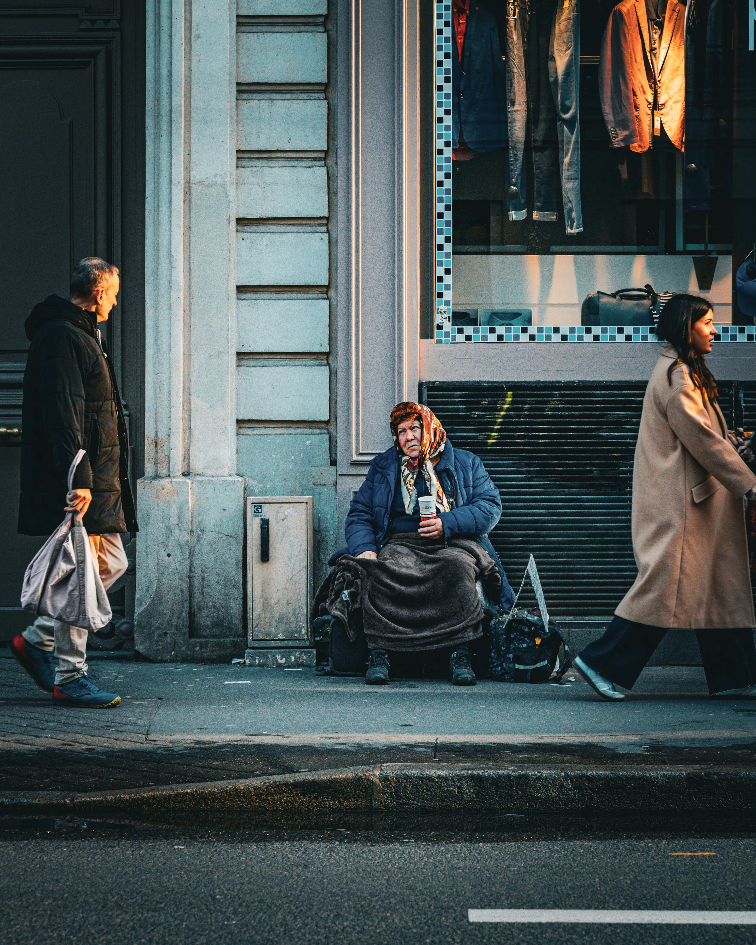 A woman sitting on the curb outside a storefront holding a cup, with a blanket and bags around her, while two other pedestrians walk past on the sidewalk.