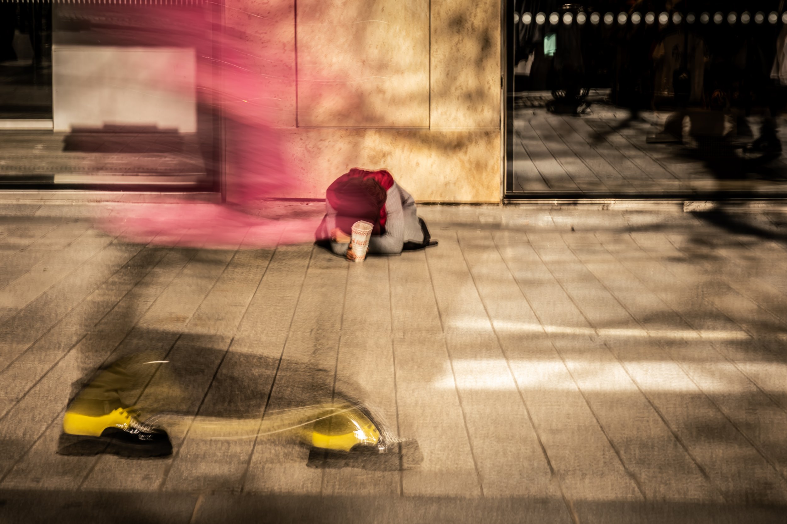 A person kneeling on the sidewalk, clutching their knees with a cup in their hand, with a blurred yellow bicycle or scooter in motion passing by in front of them, in front of a building with glass doors and concrete walls.