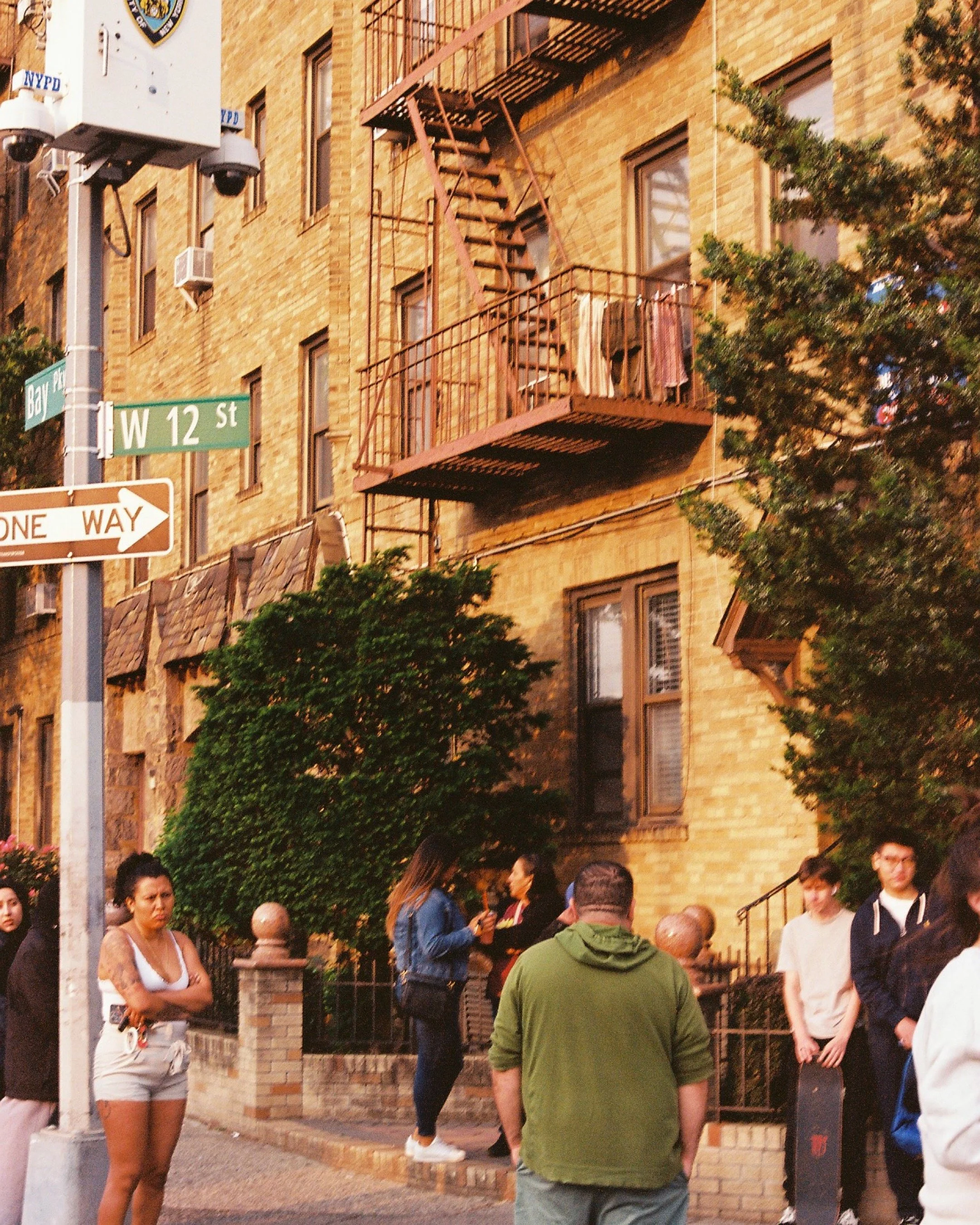People standing and waiting on a city street corner at W 12th Street and Bay Street. The backdrop is a yellow brick building with fire escape stairs and trees.
