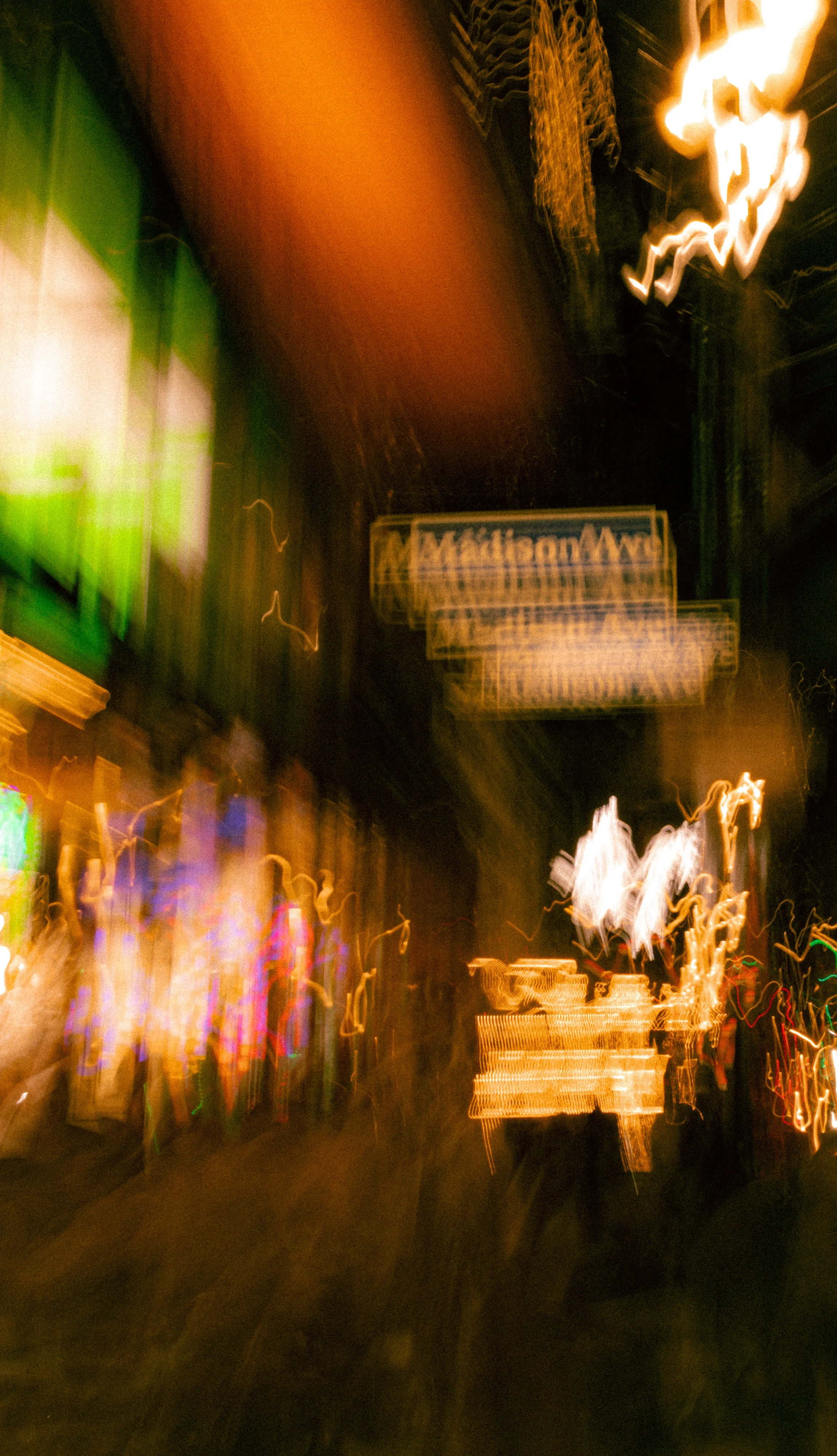 Blurred night city street scene with bright green and yellow lights and silhouettes of people walking.
