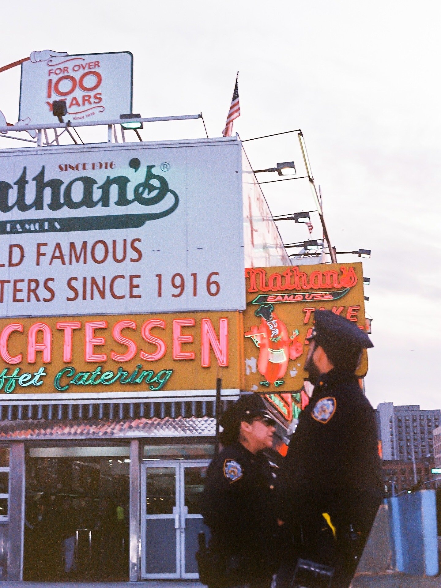 Two police officers in uniform standing outside Nathan's Famous hot dog stand with neon signs in New York City skyline.