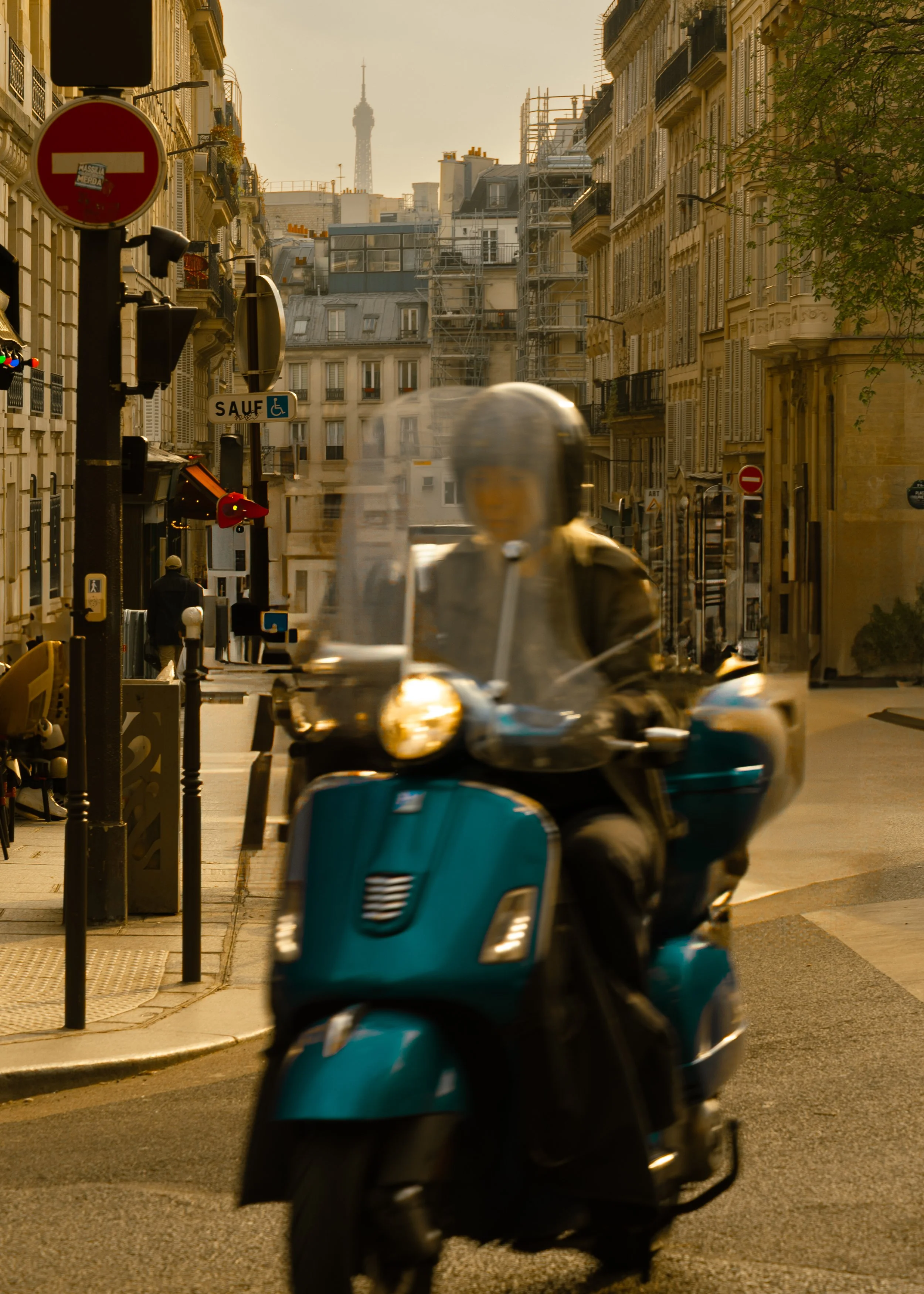 A person riding a blue scooter on a city street, with Paris buildings and the Eiffel Tower in the background, during daytime.