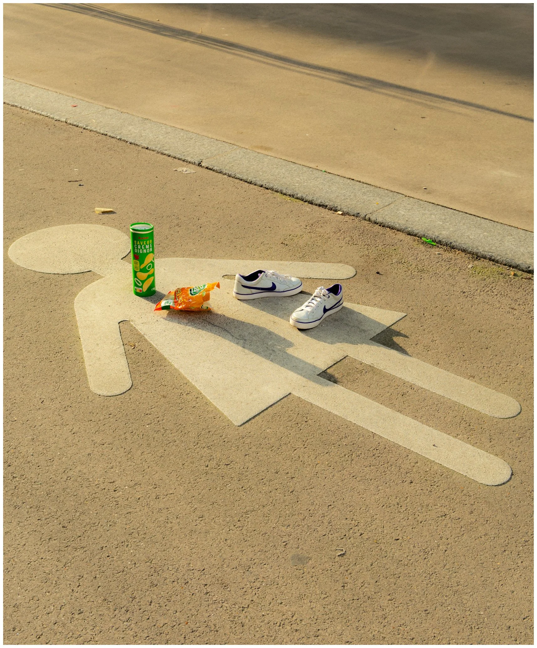 A painted pedestrian symbol on the ground with various objects placed on it, including a can of spray, a bag of snacks, and a pair of Nike sneakers.