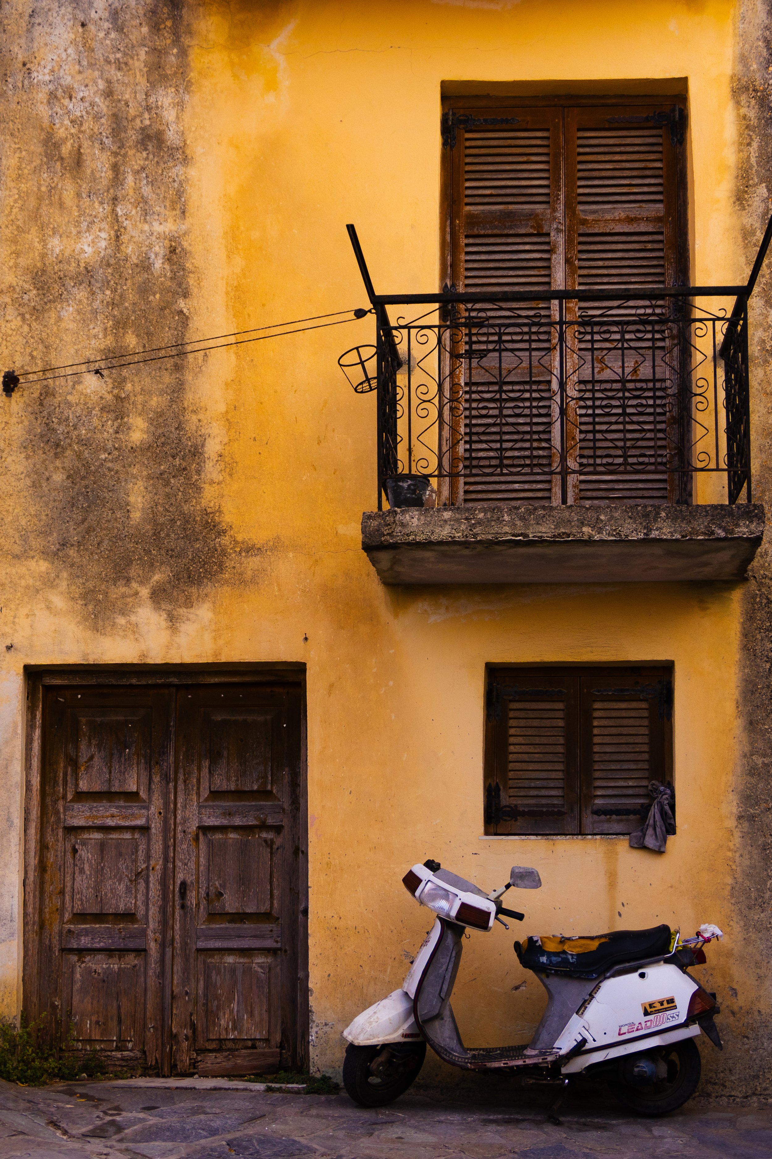 A rustic yellow building with weathered wooden doors and windows, featuring a small balcony with a black wrought iron railing, a potted plant, and a scooter parked in front.