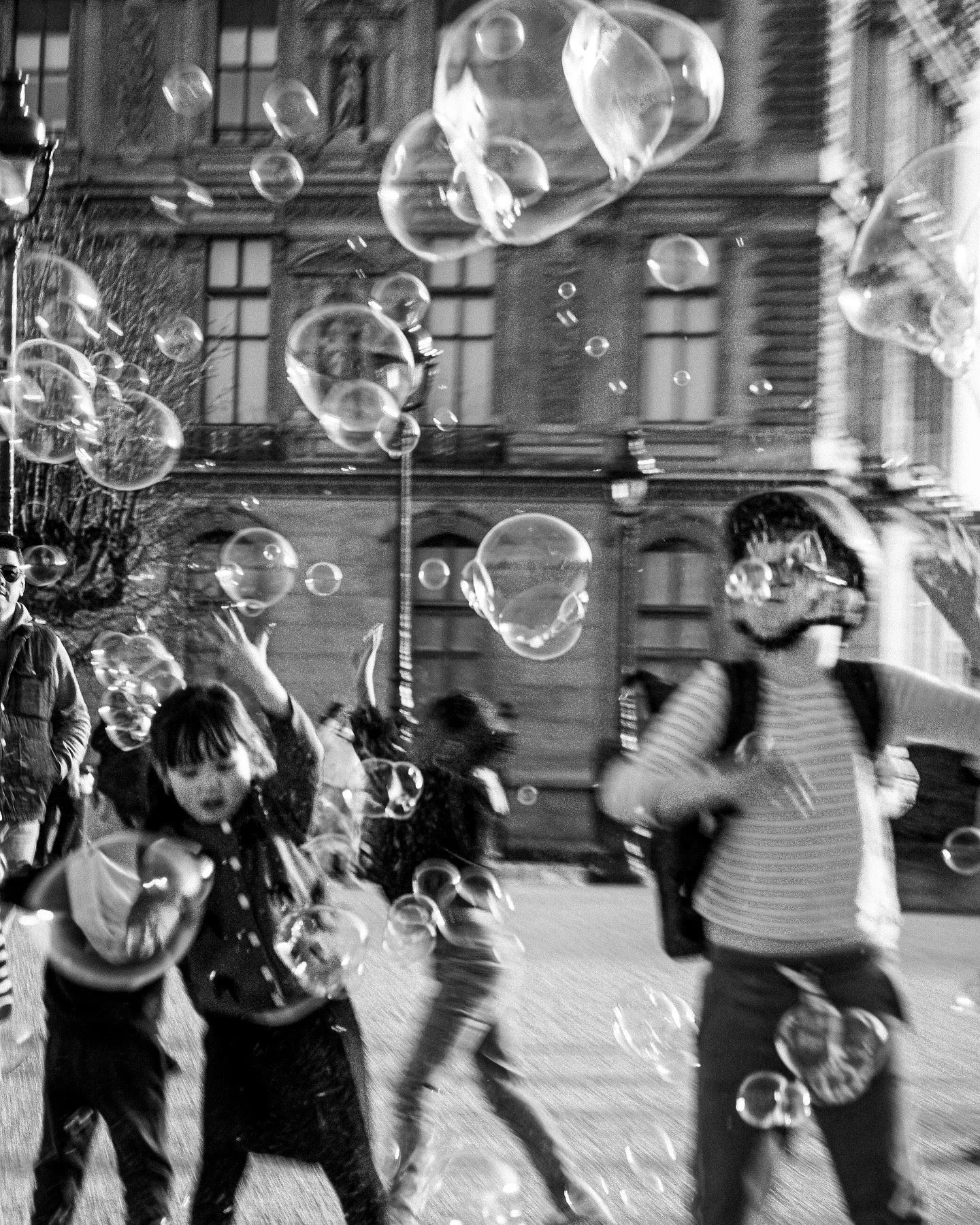 People playing with bubbles on a city street at night, with buildings and cars in the background.