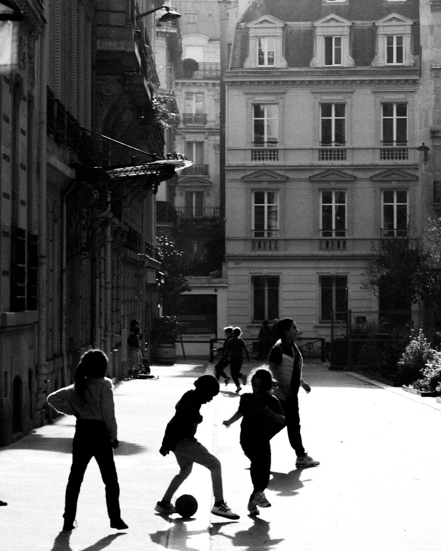 Children playing soccer in a sunlit urban courtyard surrounded by multi-story buildings.