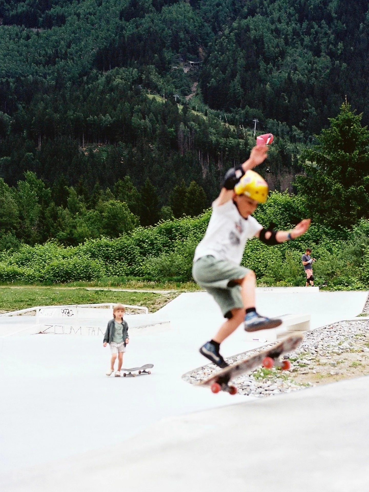 A boy wearing a yellow helmet and knee pads is skateboarding in a skatepark with a forested mountain background. A young girl is standing nearby with a skateboard, and another person is in the background.