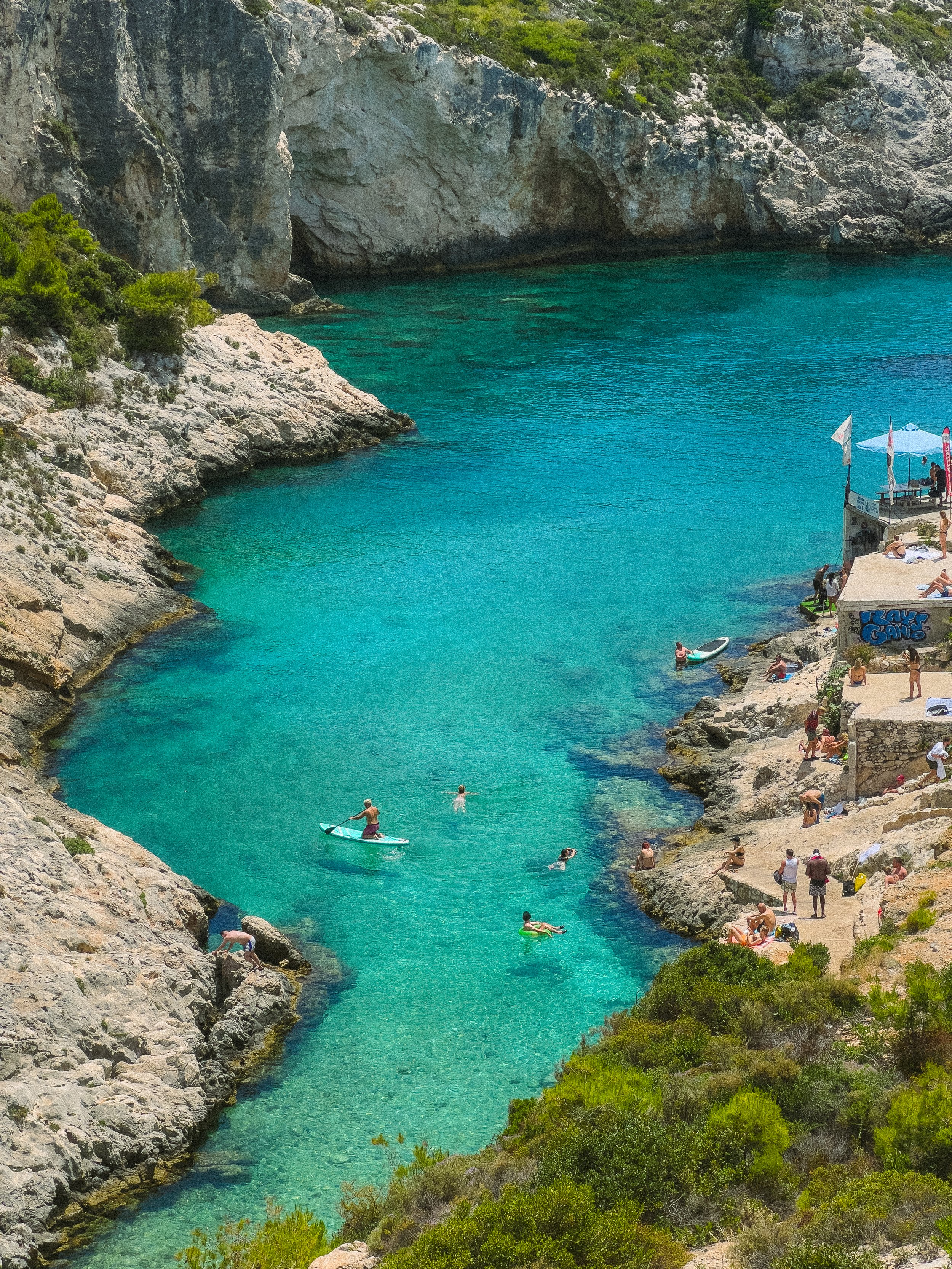 The jagged white cliffs enclose the blue cold water. A Free parking lot sits on the top with about a 10 minute walk down. There is a restaurant and sun bed rentals for reservation. You can bring kayaks and snorkeling gear to explore. We spent all day here soaking up the sun. There is also cliff jumping for the adrenaline junkies.